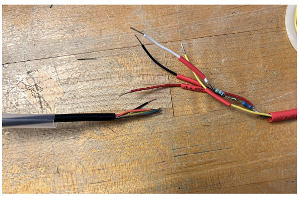 The assembly instructions for constructing the circuit to use AutoID and system power were documented for future persons to use. One of my design goals for the assembly was making the circuit streamlined and relatively indistinguishable from the surrounding cable. Any bulk increased the likelihood that the wire would catch during usage and pull the cable out of its socket. Therefore, the instructions include tips on when to add heat shrink to separate nodes, and approximately how long to cut wires and connections. Below shows the cable wiring in progress (left) and finished (right).
