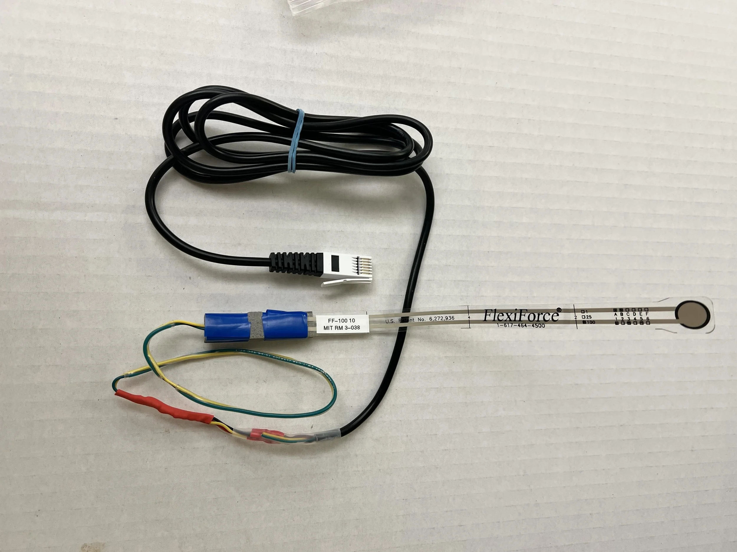Flexi-force Sensor - comes in range of sensitivities (1 lb, 10 lbs, 100 lbs). It has a smaller contact area and longer more flexible lead than the force pad. These features reduce measurement variation and in some applications, also makes the sensor less obtrusive for test subject. The 1-lb version is also used for applications where one wants to sense touch rather than measure force.