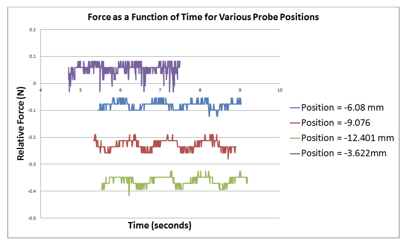 Force measurement captured by instrumented ultrasound probe, for varying probe height. Lower probe height leads to increased force magnitude, as expected.